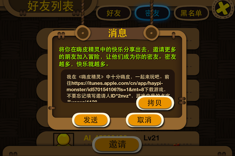 2.1.1 现在可以通过发送带有邀请人序列号和下载链接的消息,微博、短信、邮箱、facebook和twiter邀请您的朋友一起来参加冒险!