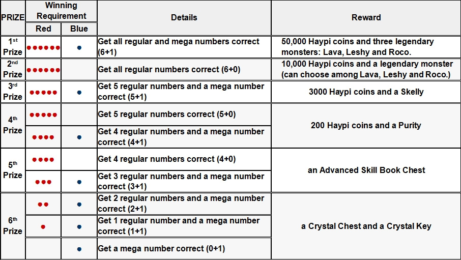 The winning numbers in the Haypi Monster lottery will be the Sunday results of China’s national lottery, the Double Color Ball. This is to ensure contest validity. (FYR: the official website of the "Double Color Ball" is http://baidu.lecai.com/lottery/draw/view/50)