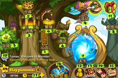 在主城中一共有公告、合成、繁殖、仓库、商店、关卡、竞技场以及活动这9个建筑物,在玩家达到一定等级时会逐一开启。