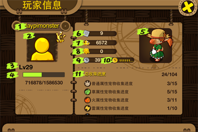 | 11. 收集进度: | 玩家所收集的宠物图鉴数目,分为总收集进度以及各属性收集进度。 |