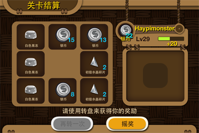轮盘抽奖:玩家在完成关卡后得到的抽奖机会。抽奖将以轮盘的形式出现,玩家将有机会获得轮盘上的任一道具。若是玩家对抽奖结果不满意则可以花费金币重新抽奖。